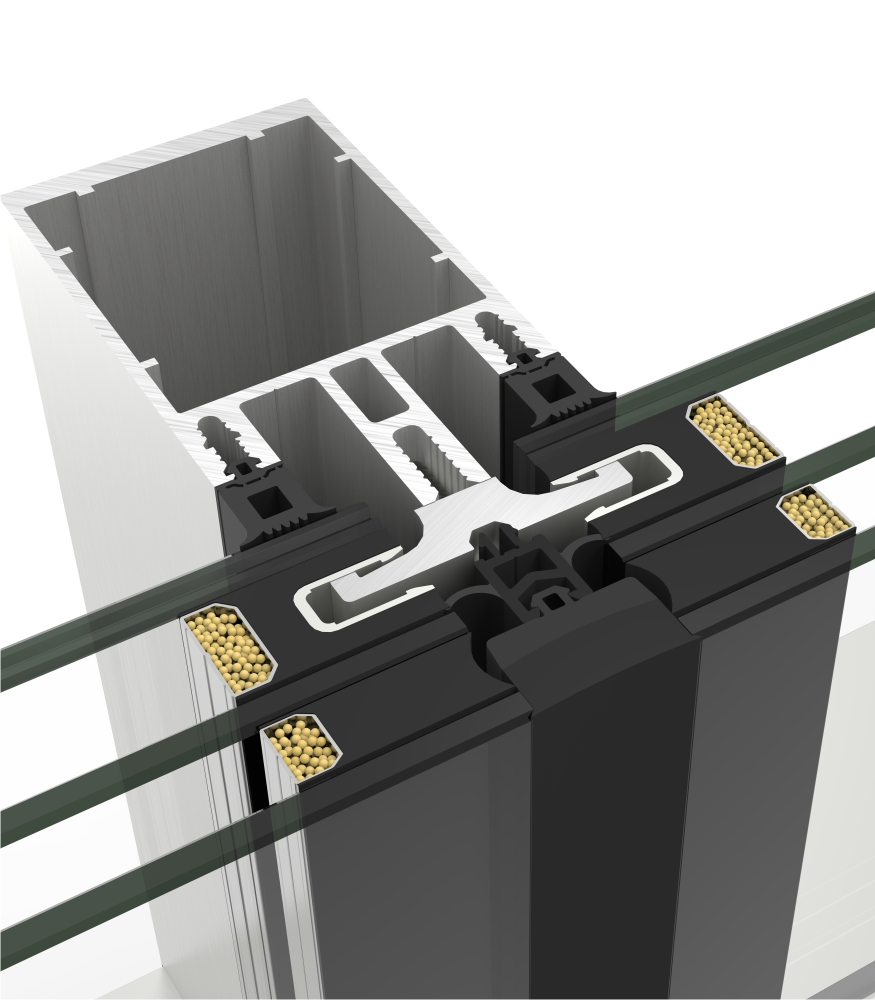 Przekładka termiczna o dużej szerokości oraz możliwość zastosowania pakietu szybowego do 44 mm, w połączeniu z konstrukcjami szklanymi o dużej grubości i wydajności energetycznej sprawiają, iż nowa gama naszych fasad cechuje się doskonałymi właściwościami termicznymi i akustycznymi.